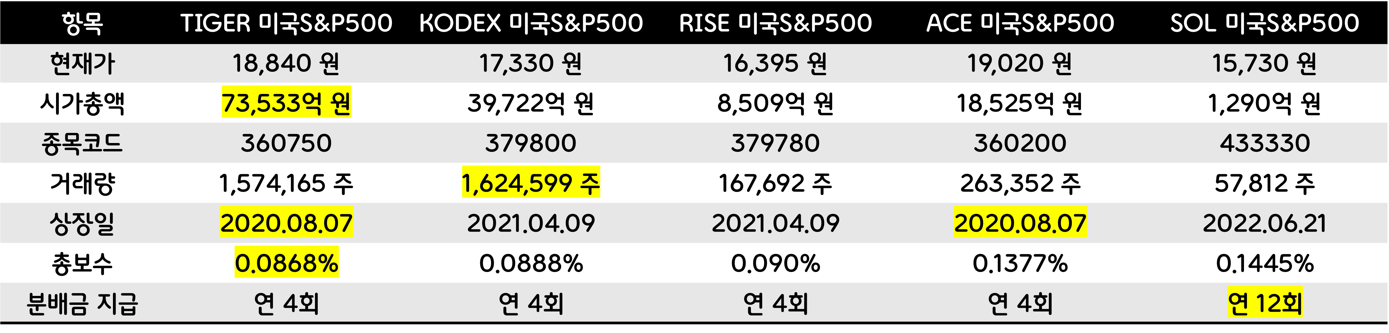 [국내 상장 S&P500 ETF 비교] TIGER, KODEX, RISE, ACE, SOL | 총보수(TER), 시가총액, 거래량 총정리