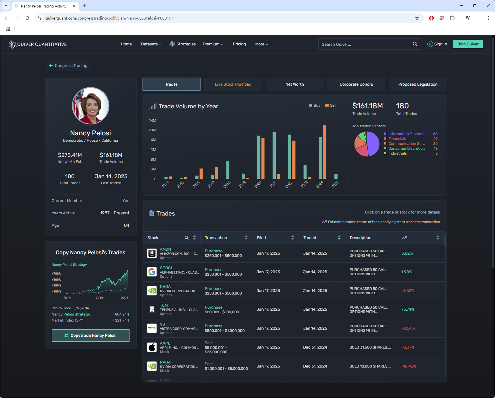 참고) 미국 금융 빅데이터 서비스 제공업체 Quiver Quantitative에서 해당 정보를 토대로 만든 낸시 펠로시의 포트폴리오입니다.