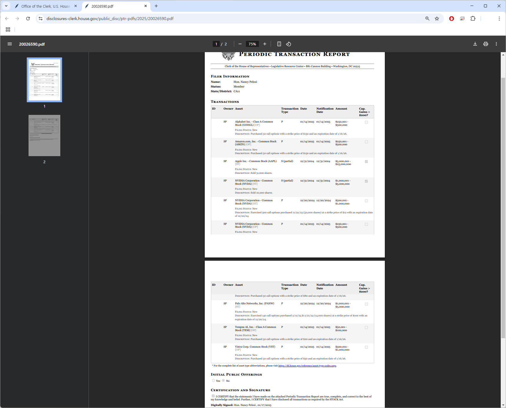 clerk.house.gov에서 낸시 펠로시의 PTR 문서 확인하기