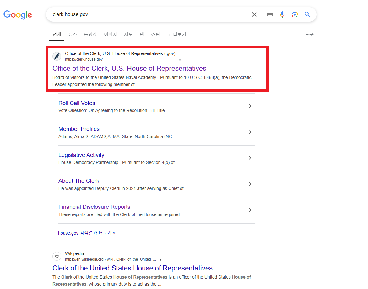 구글 검색창에 clerk house gov라고 검색하면 아래 그림처럼 뜹니다. 여기서 빨간색 박스가 쳐진 Office of the Clerk, U. S. House of Representatives 사이트에 접속합니다. 주소는 clerk.house.gov입니다.
