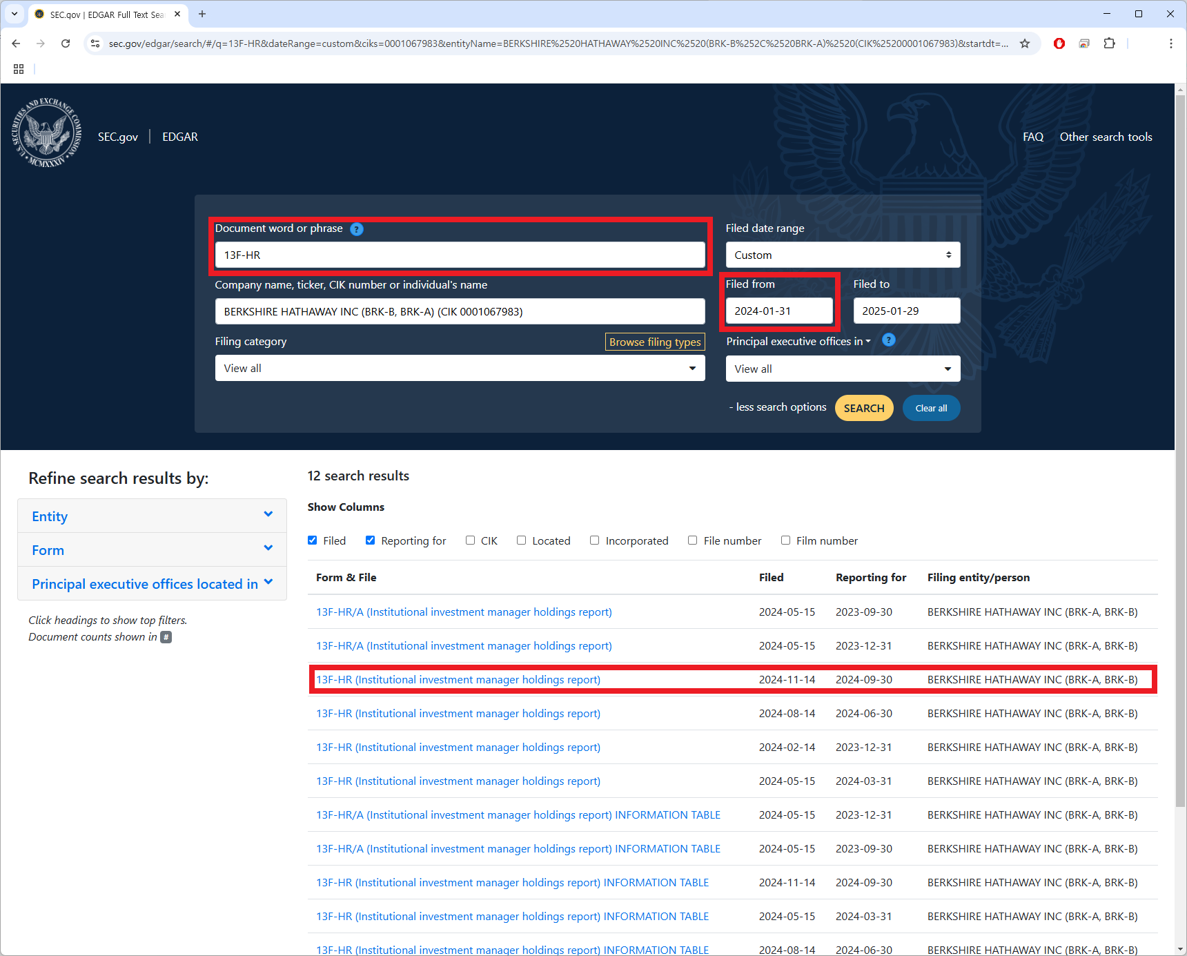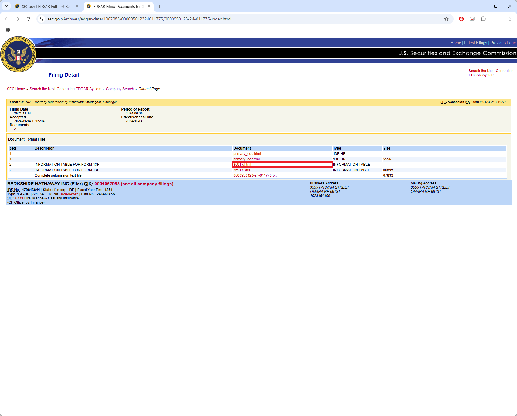 드디어 다왔습니다. 2024년 11월 14일에 올라온 보고서입니다. 문서를 클릭하면 버크셔 해서웨이가 보유중인 종목을 확인할 수 있습니다. 매수 혹은 매도한 종목을 알고싶으시다면, 이전에 올라온 13F-HR과 비교해서 확인하시면 됩니다.