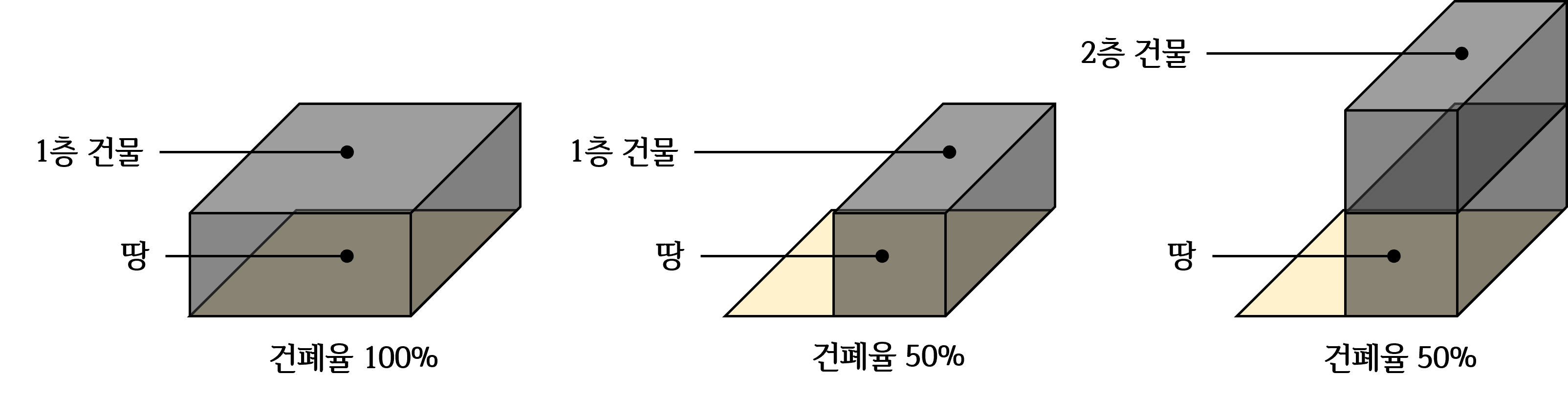 • 예시: 대지 면적이 100평이고 건폐율이 50%라면, 지상 건축면적은 최대 50평까지만 허용