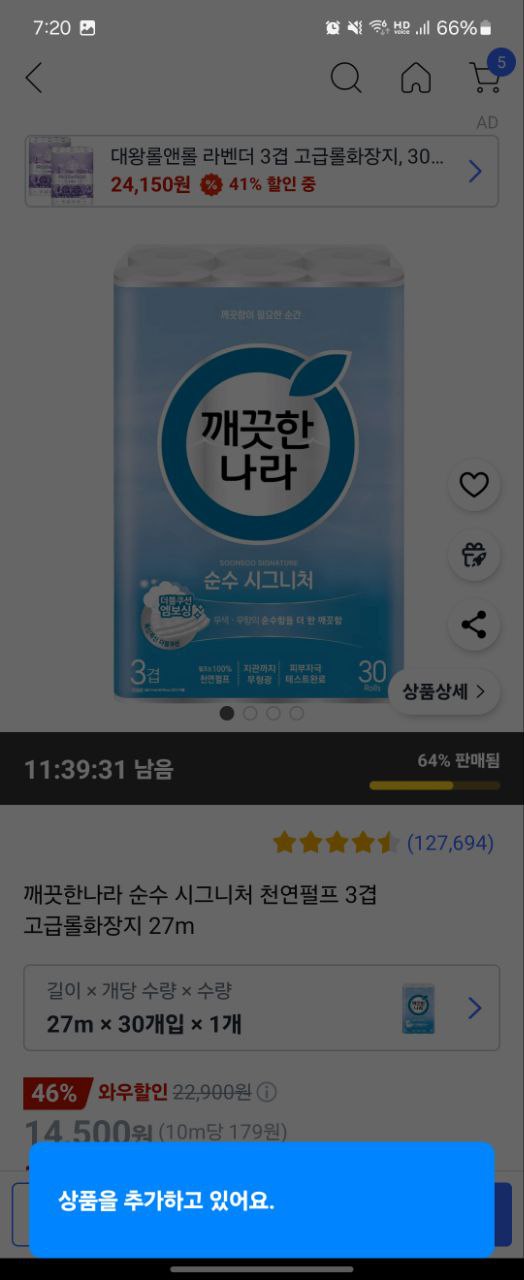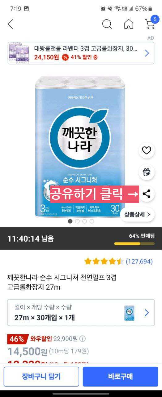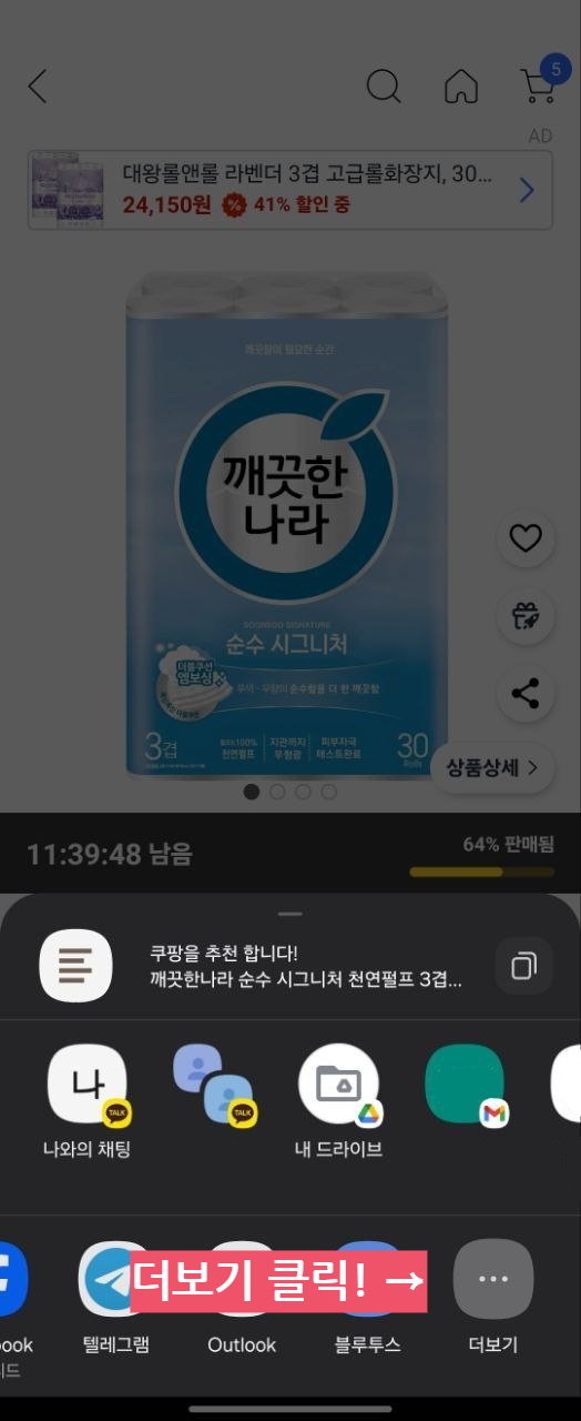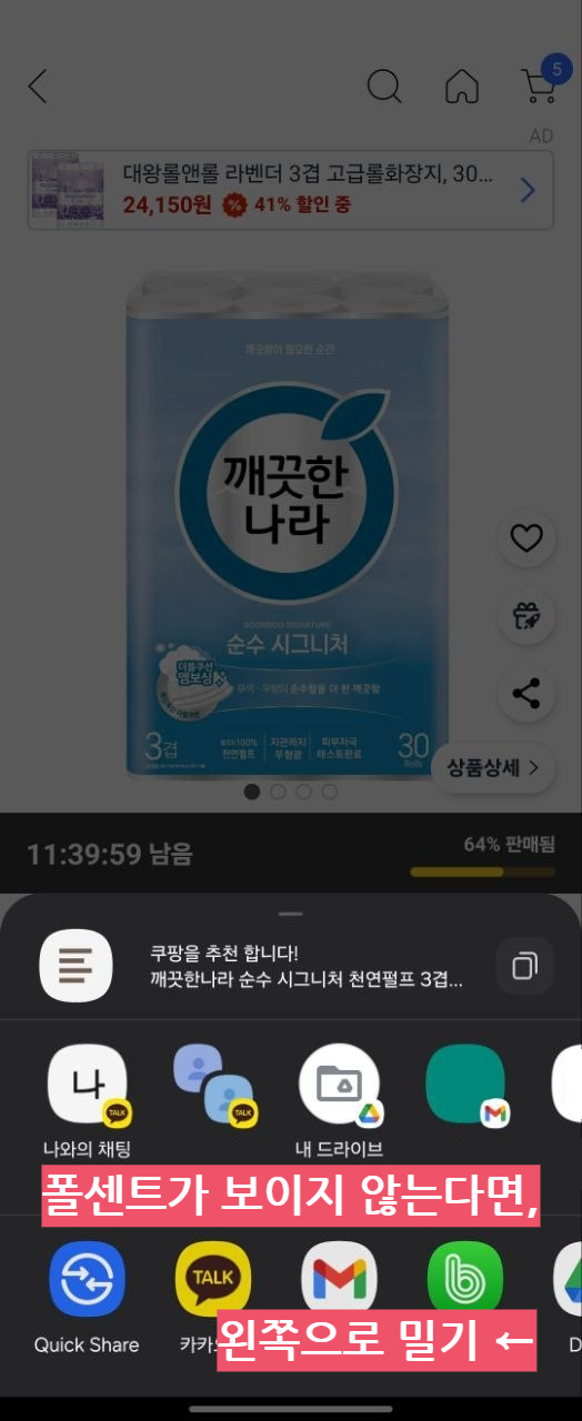 휴지 품목화면에서 공유하기를 눌러 폴센트를 찾습니다.