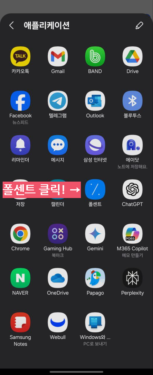 화면에 보이지 않는다면 아래쪽 목록을 왼쪽으로 밀어서 더보기를 누른 후, 폴센트를 찾아서 눌러줍니다.