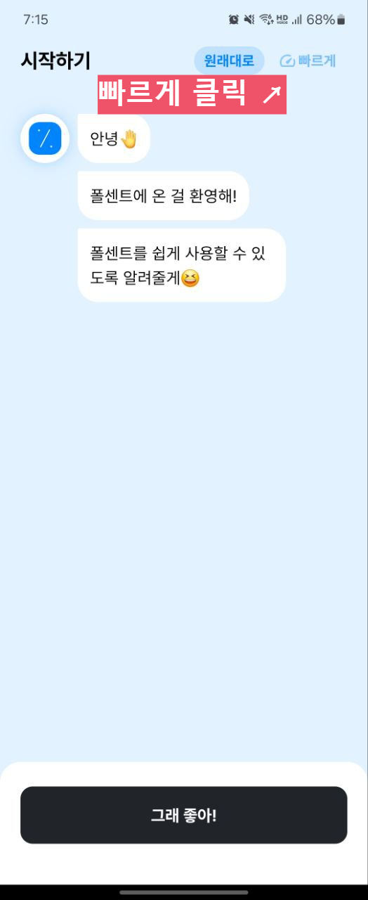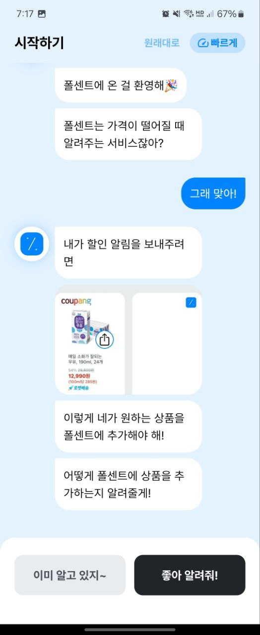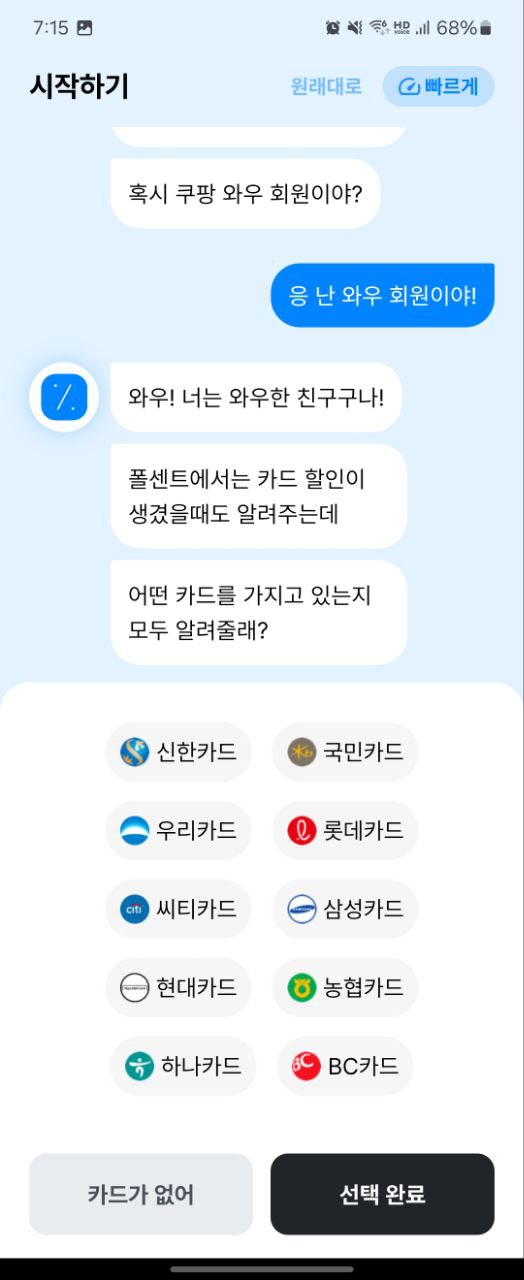 설치가 끝나면 폴센트를 실행합니다. 그럼 친절하게 메신저 형태로 대화를 시작하게 되는데요. 답답하신 분들은 오른쪽 위에 빠르게를 눌러서 튜토리얼을 진행합니다. 알림을 허용해야 자신이 추가한 품목에 대해서 알림을 주기 때문에 꼭 허용하시길 바랍니다. 카드 할인이 있을 때도 알려주기 때문에 자주쓰는 카드사가 어디인지도 추가합니다.
