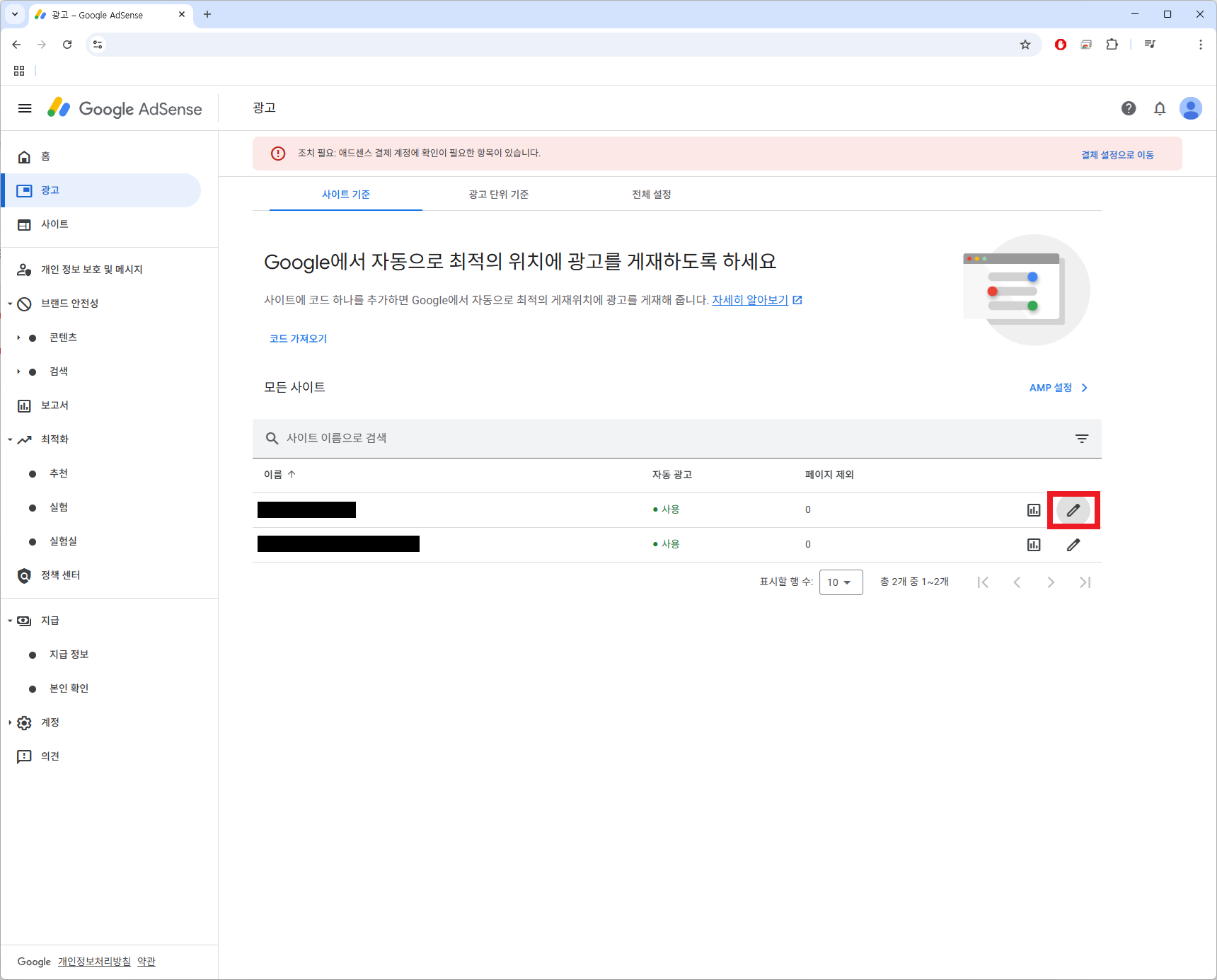 3. 광고 설정을 수정할 사이트 선택