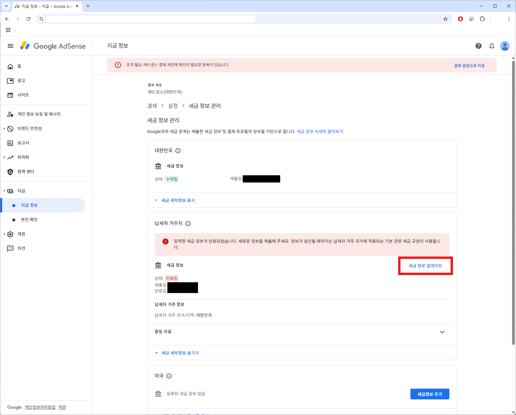 애드센스에 접속하여 해당 문서를 제출합니다. 애드센스에 들어가면 조치 필요: 애드센스 결제 계정에 확인이 필요한 항목이 있습니다. 가 뜨고 결제 설정으로 이동을 누르면 입력한 세금 정보가 만료되었습니다. 새로운 정보를 제출해 주세요. 정보가 승인될 때까지는 납세자 거주 국가에 적용되는 기본 관련 세금 규정이 사용됩니다. 이라는 경고성 메시지가 보이면 세금 업데이트를 눌러서 세금 정보를 업데이트하면 됩니다.