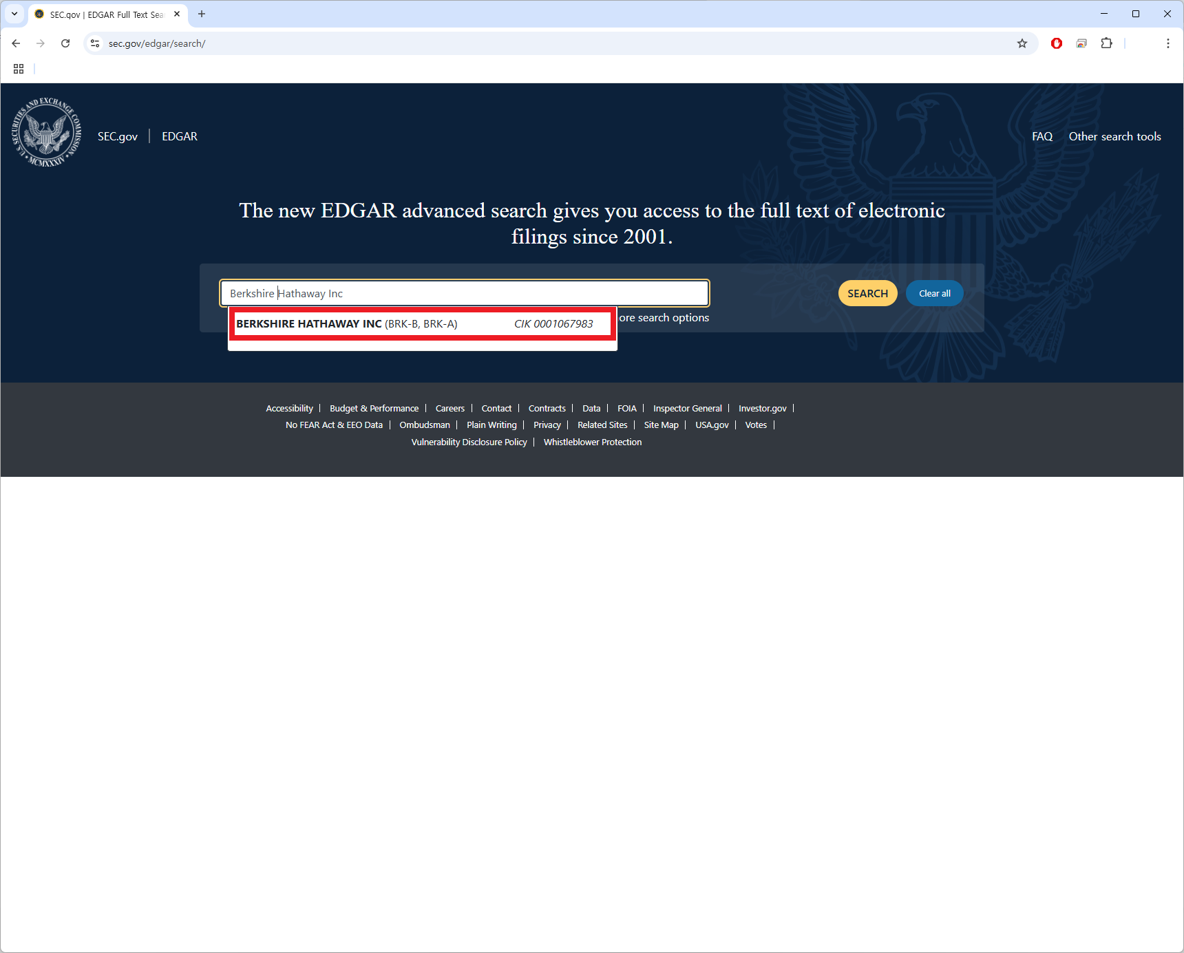 검색창에 'Berkshire Hathaway Inc'를 입력합니다. 검색 결과에서 버크셔 해서웨이 회사와 CIK를 확인한 후 클릭합니다. CIK(Central Index Key)는 미국 증권거래위원회(SEC)가 각 등록된 회사, 개인 및 펀드를 고유하게 식별하기 위해 부여하는 고유한 식별 번호입니다. CIK 코드를 통해 SEC의 EDGAR 시스템에서 특정 회사의 모든 제출 문서를 쉽게 검색하고 확인할 수 있습니다. State/Country의 NE는 네브래스카(Nebraska) 주의 약어입니다.