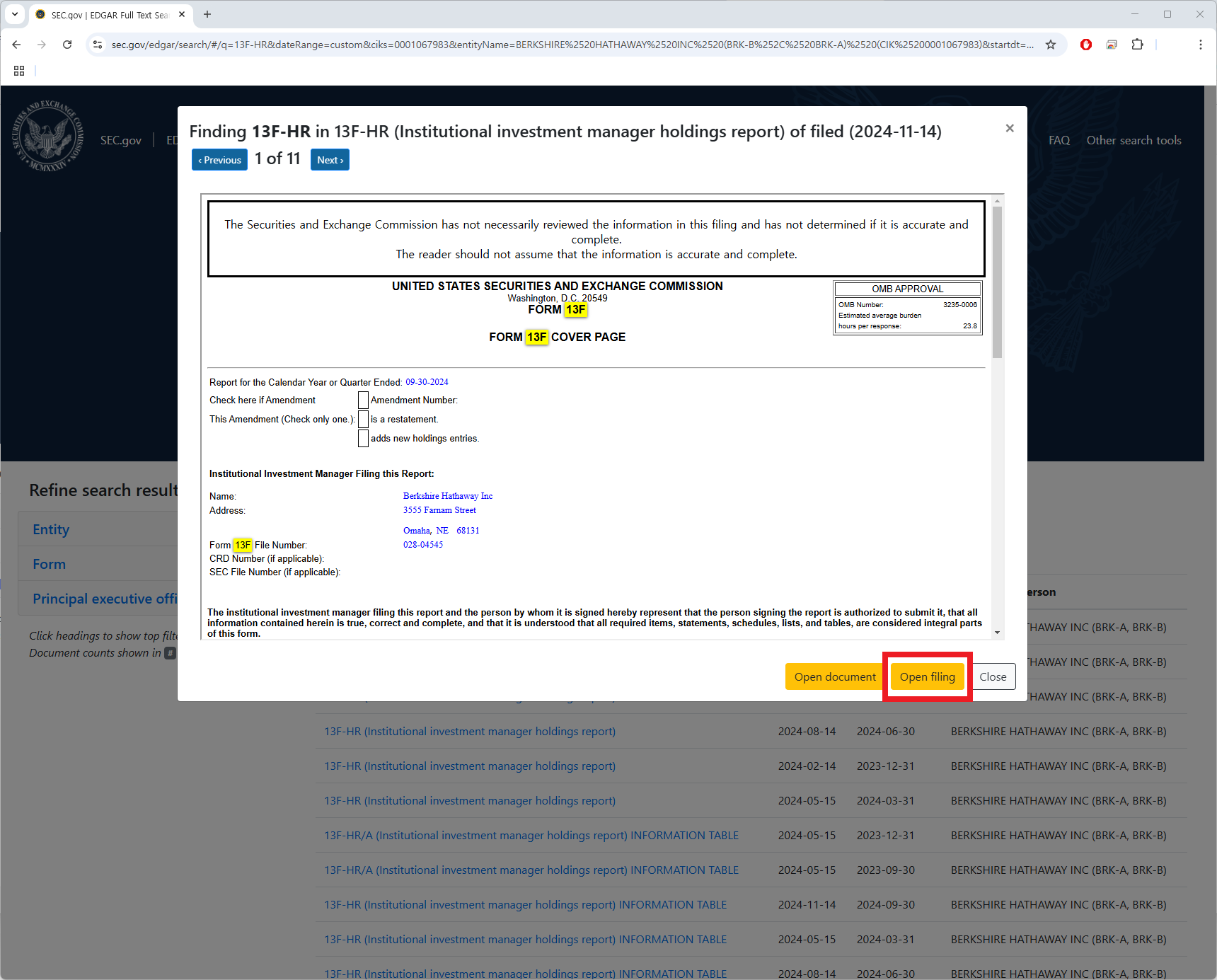 드디어 다왔습니다. 2024년 11월 14일에 올라온 보고서입니다. 문서를 클릭하면 버크셔 해서웨이가 보유중인 종목을 확인할 수 있습니다. 매수 혹은 매도한 종목을 알고싶으시다면, 이전에 올라온 13F-HR과 비교해서 확인하시면 됩니다.